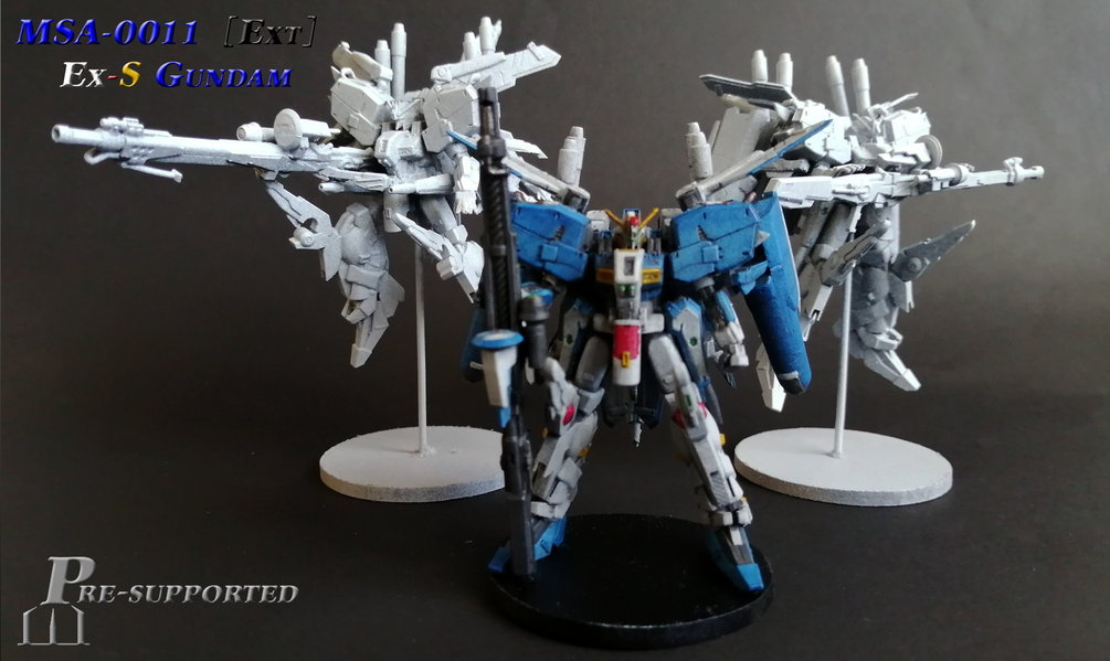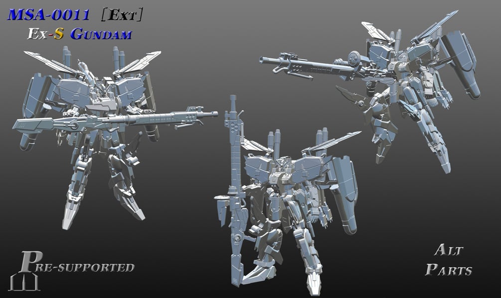 With a little more inspiration taken from the Master Grade model kit as well as the Gundam Fix Figuration version, the kit includes 3 different poses, all with alternate parts, as well as the Ex-S Gundam's signature Beam Smart Gun (with an alternate Deep Striker inspired version)